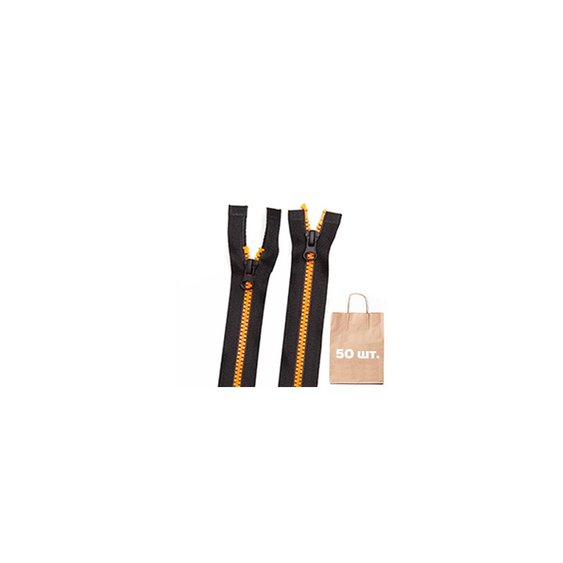 Упаковка 50 шт. Молния тип 3, тракторная, классическая, длинна 70 см. Разъемная. Состав: зубья - вислон (vislon), полотно - полиэстер (PE). Ширина полотна в закрытом состоянии 28 мм. Количество бегунков: 2. Способ покраски бегунка: electrophoresis metal. Количество циклов открытий-закрытий: 10000. Цвет: цвет полотна - черный, цвет зубьев - оранжевый. Слайдеры черные. Производитель: TM MAX Zipper. Страна производства: Тайвань.
