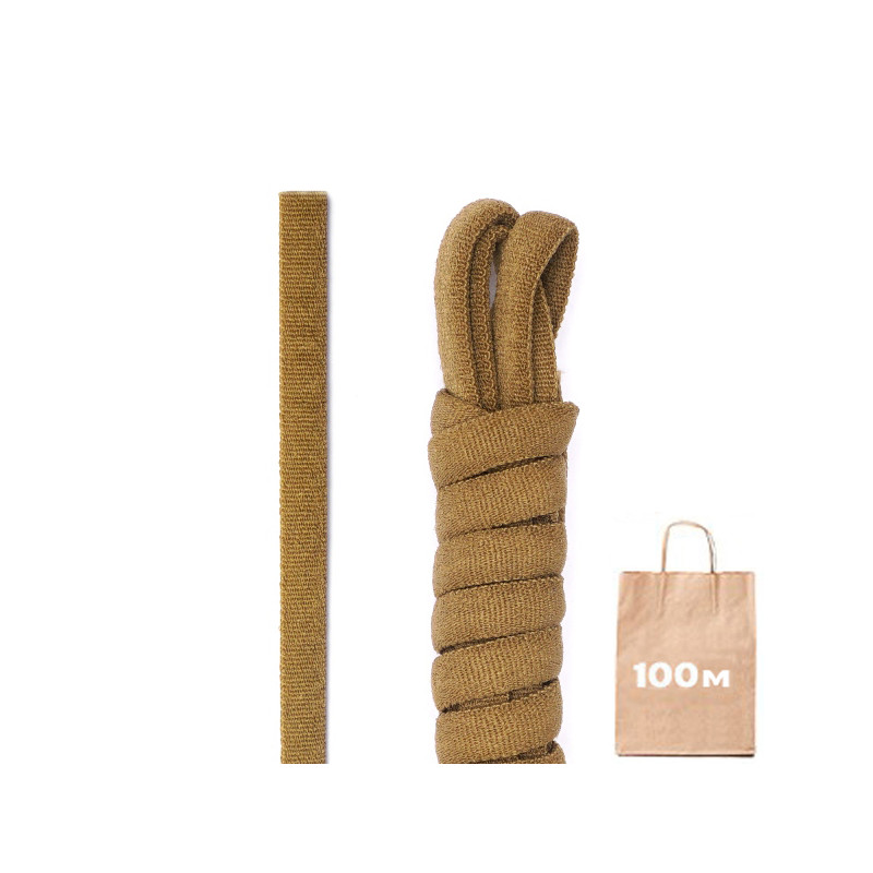 Бухта 100 метрів. Резинка 5 мм Tubular. Особлива резинка для використання у пошитті одягу: для головних уборів та легких курток. Матеріал: поєднання еластичних волокон поліестеру та еластану. Можливі кольори: чорний, олива, койот, білий. Країна виробництва: Китай.