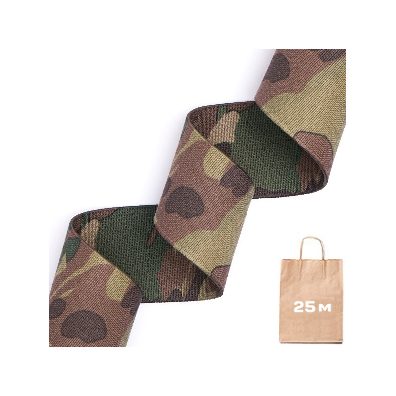 Рулон 25 метрів. Ширина полотна 50 мм. Двустороння. Високоміцна, для спорядження та амуніції. Матеріал: еластан та поліестер. Еластичні волокна високої якості будуть гарантувати довгострокове використання без деформації самої резинки. Плетення більш щільне, ніж у резинки HD. Можливий колір: Multi Camouflage. Країна виробництва: Китай.