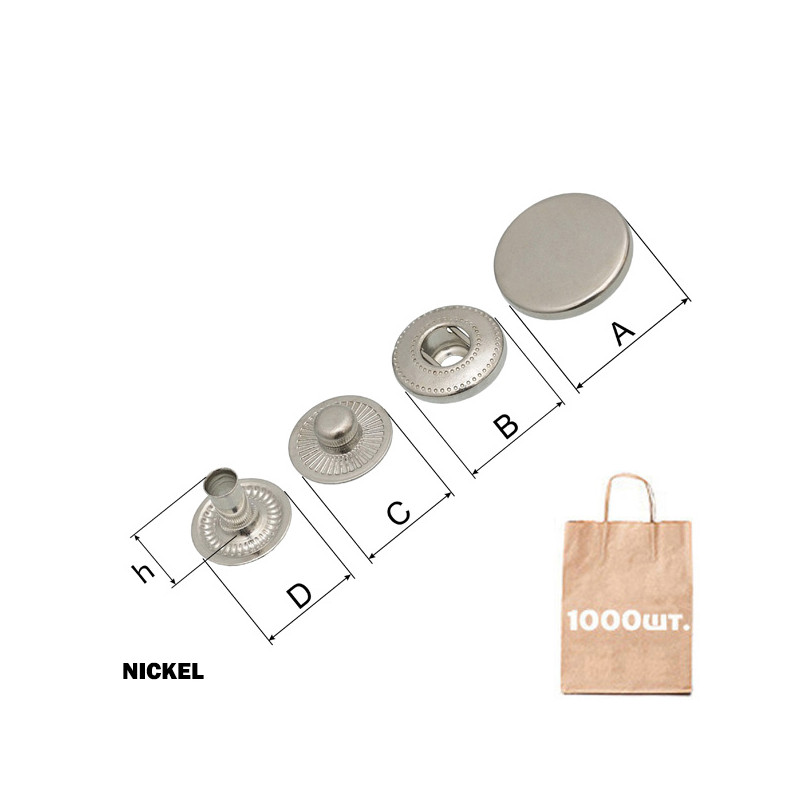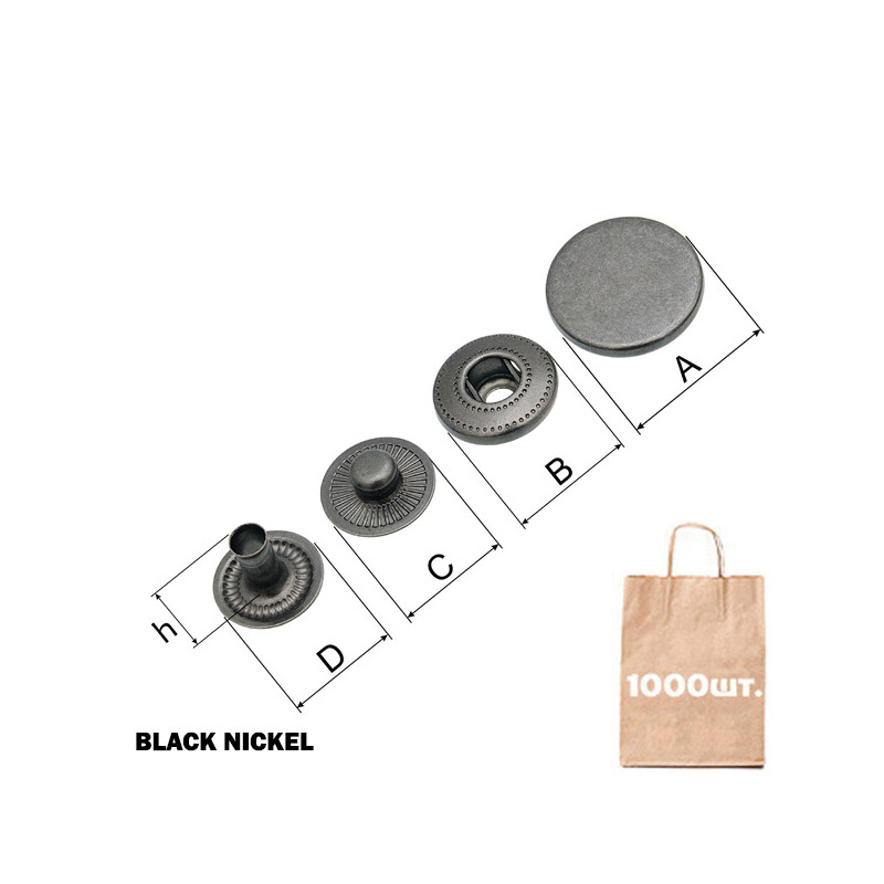 Кнопка Alfa-S SPRING SNAP BUTTON, спіральна COIN CAP 17 мм. Матеріал: латунь. Розмір: A: d 17 мм; B: d 13,5 мм; C: d 12,5 мм; D: d 12 мм. Висота ніжки: 8,8 мм. Перевага: висока якість, надійність, висока міцність, не іржавіє. Можливі кольори: чорний, Antic Brass, темний нікель (Black Nickel), нікель (Nickel). Країна виробництва: Туреччина.