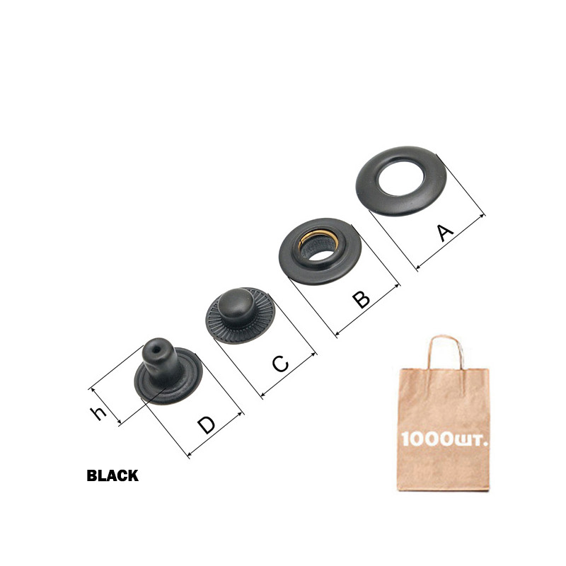 Кнопка BETA, кільцева, Snap Button, 19 мм. Матеріал: латунь. Розміри: A: d 19 мм; B: d 15 мм; C: d 14 мм; D: d 12 мм. Висота ніжки: 8,3 мм. Перевага: висока якість, надійність, висока міцність, не іржавіє. Можливі кольори: чорний. Країна виробництва: Туреччина.
