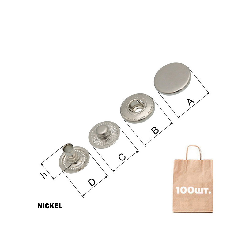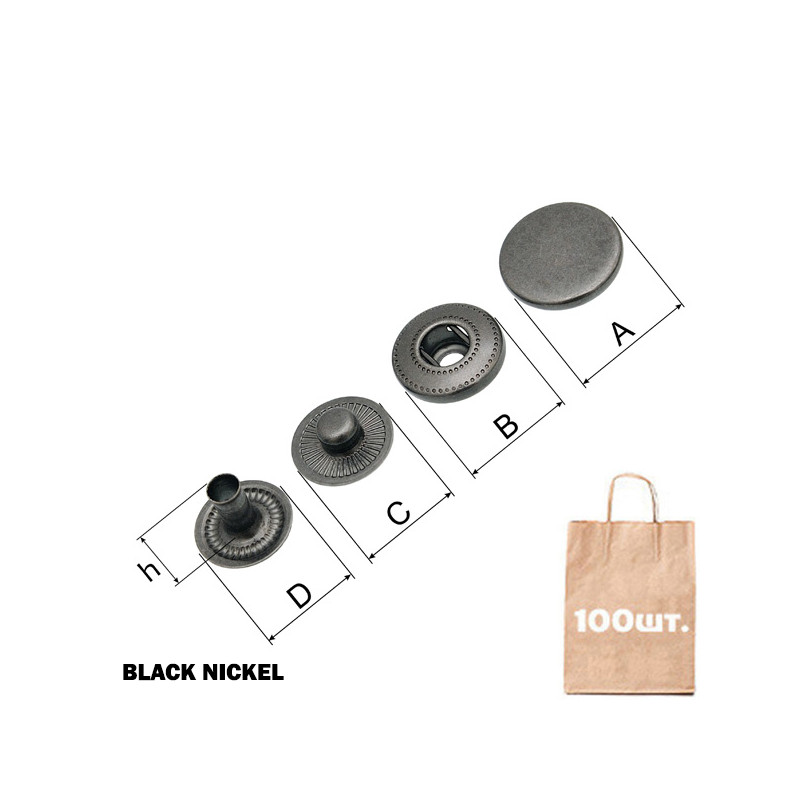 Кнопка Alfa-S SPRING SNAP BUTTON, спіральна COIN CAP 15 мм. Матеріал: латунь. Розмір: A: d 15 мм; B: d 13,5 мм; C: d 12,5 мм; D: d 12 мм. Висота ніжки (h): 8,8 мм. Перевага: висока якість, надійність, висока міцність, не іржавіє. Можливі кольори: чорний, Antic Brass, темний нікель (Black Nickel), нікель (Nickel). Країна виробництва: Туреччина.