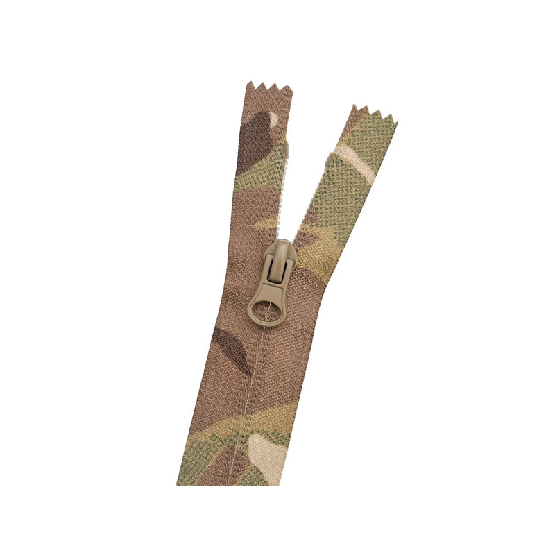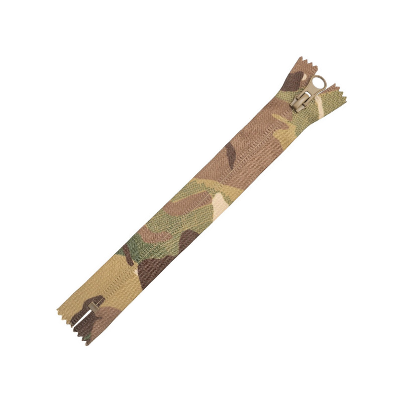 Блискавка тип 5, спіральна, в иворітна (реверсна або потаємна), довжина 20 см. Нероз'ємна, 1 бігунок. Для верхнього одягу, військового спорядження, рюкзаків. Склад: спіраль - нейлон (РА), полотно - поліестер (РЕ). Доступний принт: Multi Camouflage+Tan. Виробник: TM MAX Zipper. Країна виробництва: Китай.
