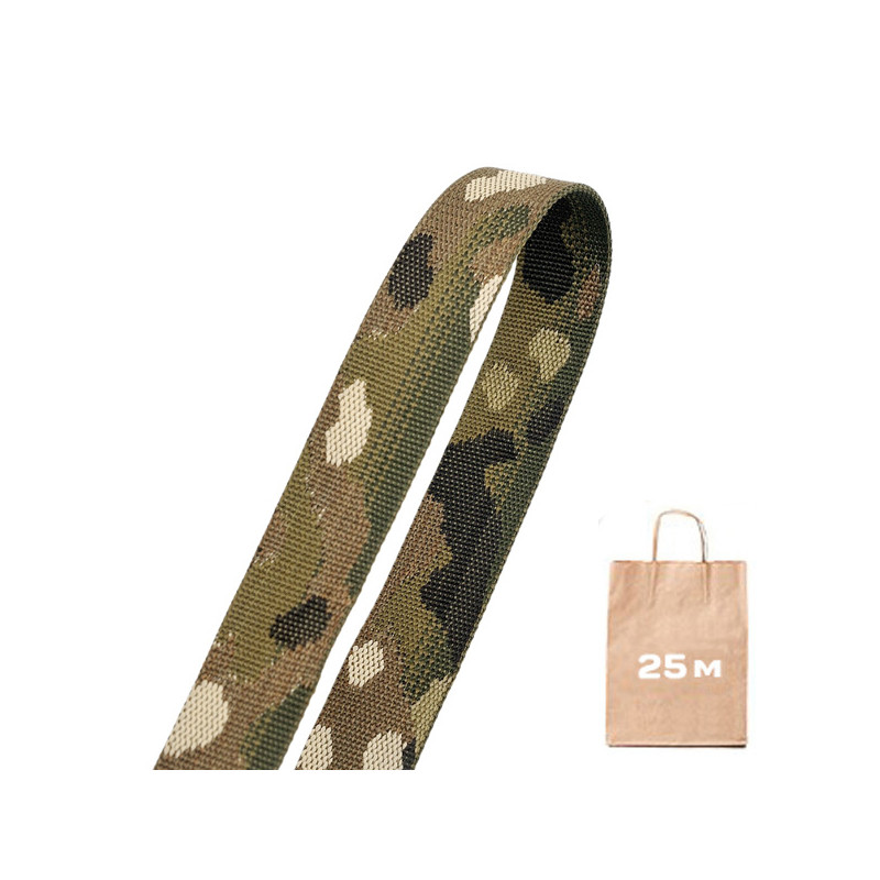 Стрічка поліамідна ремінна, жакардова . MultiCamouflage із IRR просоченням. Товщина: 1,2 мм. Ширина стрічки 25 мм. Матеріал: нейлон (поліамід). Переваги: стійка до агресивного впливу зовнішнього середовища, перепадам температур, не гниє та не вицвітає. Висока міцність на розрив. Країна виробництва: Китай.