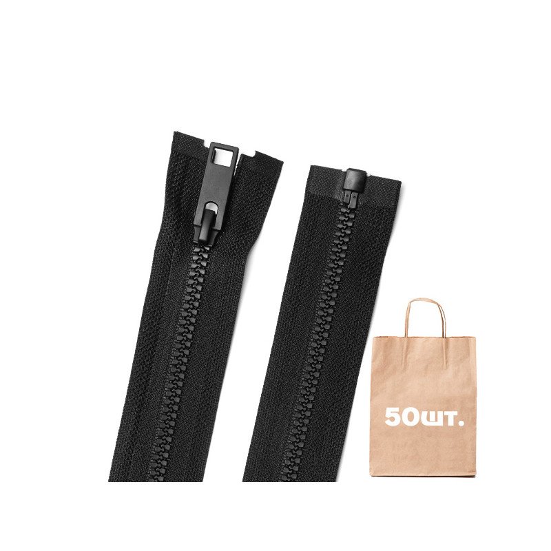 Упаковка 50 шт. Блискавка тип 5, тракторна, довжина 60 см. Роз'ємна. Форма зубців: "Ялинка". Форма пулера: 169. Склад: зубці - віслон (vislon), полотно - полиэстер (PE). Кількість бігунків: 1. Спосіб фарбування бігунка: electrophoresis metal. 10 000 циклів відкриттів/закриттів. Доступний колір: чорний. Виробник: TM MAX Zipper. Країна виробництва: Китай.